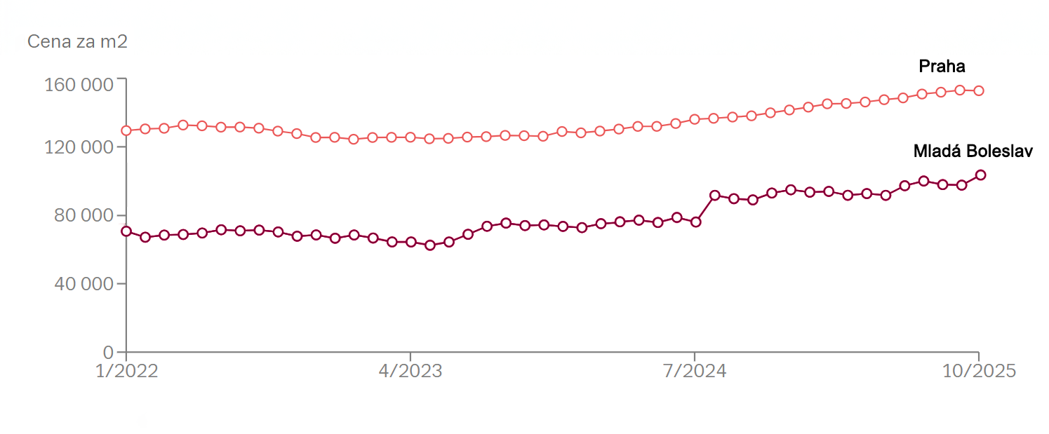 Graf: Vývoj cen nemovitostí v Praze a Mladé Boleslavi, zdroj: Sreality.cz