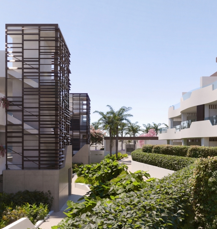 Exclusive residential complex located on the New Golden Mile between Marbella and Estepona. Elegant clean lines blend seamlessly into the natural environment and create a feeling of perfect harmony. It offers 60 apartments with layouts from two to four rooms. Prices from EUR 921,000.The apartments are characterized by spaciousness, great natural light, large open spaces and large-format windows designed to make the best use of natural light and stunning views of the surrounding countryside. The standards include ceramic floors and tiles, furnished bathrooms and kitchens, built-in wardrobes, air conditioning, underfloor heating, underground garage parking, security camera system of the entire area. The common areas of the complex include a swimming pool, a wellness center, a gym, changing rooms, a coworking space and a shared kitchen.