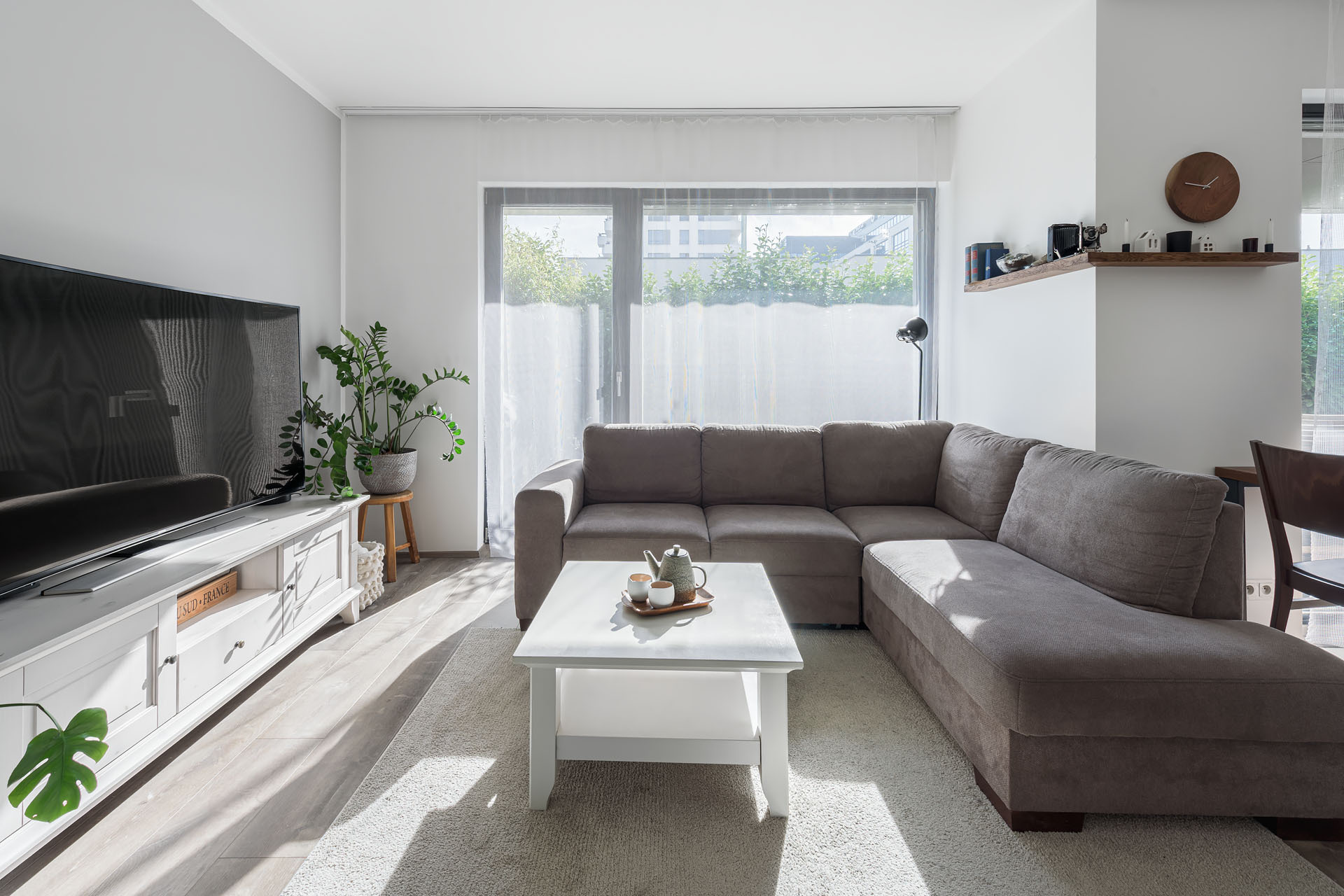 Планировка включает в себя главную спальню, детскую комнату, просторную ванную комнату с туалетом, отдельный туалет и практичную кладовую. Сердцем квартиры является светлая гостиная с кухонной зоной, ориентированная с востока на запад с акцентом на южную сторону, что обеспечивает исключительное естественное освещение в течение дня.