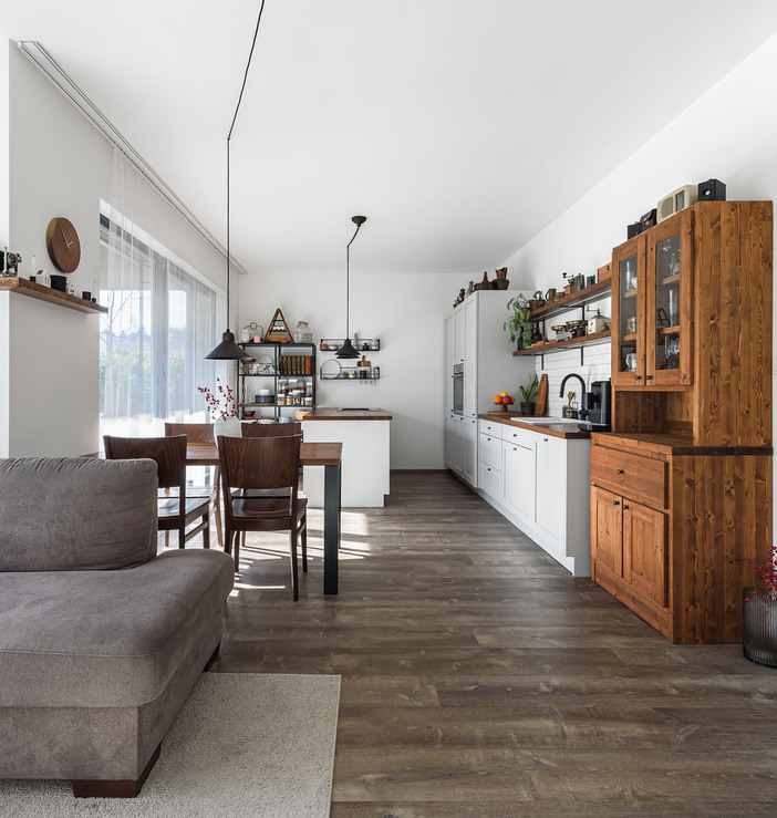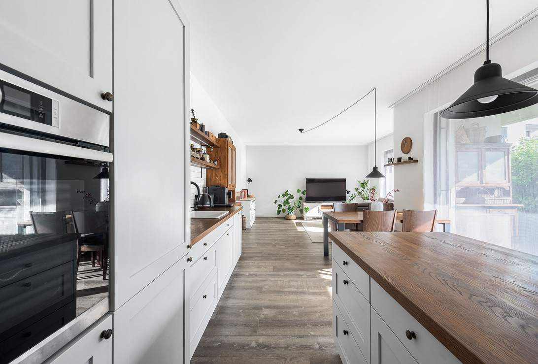 Интерьер отделан на высоком уровне. В числе особенностей – деревянные евроокна, виниловое напольное покрытие и элегантные безрамные двери, покрытые белым лаком. Кухня выполнена из дерева с дубовой столешницей и оборудована высококачественной бытовой техникой Bosch, включая варочную панель со встроенной вытяжкой. Вместительные шкафы в прихожей, спальне и детской комнате обеспечивают достаточно места для хранения вещей.